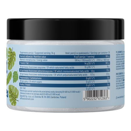 OstroVit Aceite de Coco es un producto 100% natural, refinado, sin sal ni azúcar añadidos y libre de impurezas. Es un preparado especialmente recomendado para consumidores conscientes y personas físicamente activas.