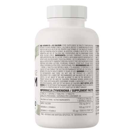 OstroVit Vitamina D3 + K2 + Calcio es un suplemento dietético completo que proporciona una fuente de colecalciferol, vitamina K2 en forma de MK-7, que es la mejor absorbida por el cuerpo humano, y el valioso elemento calcio. Disponible en comprimidos fáciles de tragar, este producto se ha desarrollado para las personas que necesitan complementar su dieta diaria con micronutrientes valiosos.