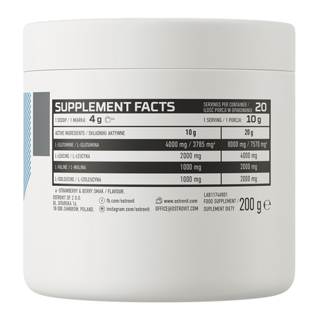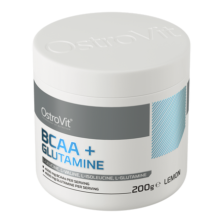 OstroVit BCAA + Glutamina es un suplemento dietético de alta calidad que proporciona una fuente de L-glutamina y los aminoácidos de cadena ramificada L-leucina, L-isoleucina y L-valina. Es un preparado con un refrescante sabor a limón, disponible en un cómodo formato en polvo. Es un producto diseñado para deportistas y personas físicamente activas que desean complementar su dieta diaria con valiosos aminoácidos.