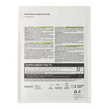 OstroVit utiliza monohidrato de creatina, es decir, la combinación de una molécula de creatina con una molécula de agua en una sola molécula - debido a que la creatina es un compuesto hidrófilo, se combina fácilmente con el agua y por lo tanto es una sustancia con una excelente biodisponibilidad. El monohidrato de creatina es la forma más simple de creatina en términos de su estructura, y al mismo tiempo el compuesto más popular entre los atletas - es ideal tanto para principiantes en estilos de vida activos como para profesionales, debido al hecho de que la creatina aumenta el rendimiento físico en el caso de ejercicios físicos sucesivos, cortos y muy intensos, y los efectos beneficiosos se producen cuando se consumen 3 g de creatina al día.