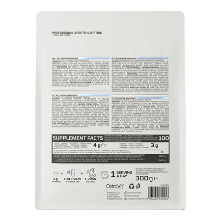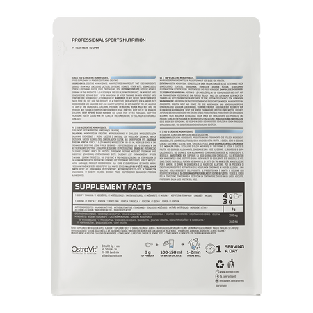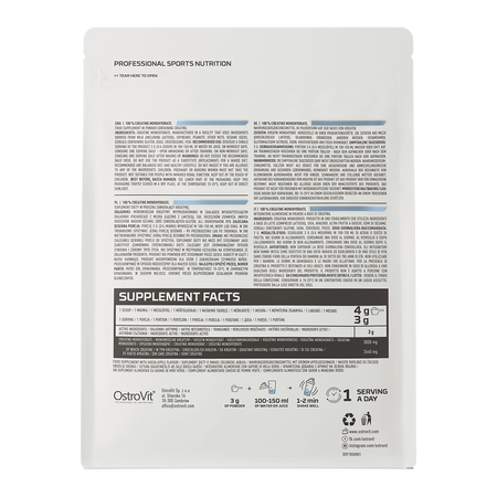 OstroVit utiliza monohidrato de creatina, es decir, la combinación de una molécula de creatina con una molécula de agua en una sola molécula - debido a que la creatina es un compuesto hidrófilo, se combina fácilmente con el agua y por lo tanto es una sustancia con una excelente biodisponibilidad. El monohidrato de creatina es la forma más simple de creatina en términos de su estructura, y al mismo tiempo el compuesto más popular entre los atletas - es ideal tanto para principiantes en estilos de vida activos como para profesionales, debido al hecho de que la creatina aumenta el rendimiento físico en el caso de ejercicios físicos sucesivos, cortos y muy intensos, y los efectos beneficiosos se producen cuando se consumen 3 g de creatina al día.