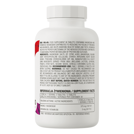 - Fuente de magnesio y vitamina B6 - una ración del suplemento dietético aporta al organismo 375 mg de magnesio en la forma altamente absorbible de citrato de magnesio y 5 mg de vitamina B6.