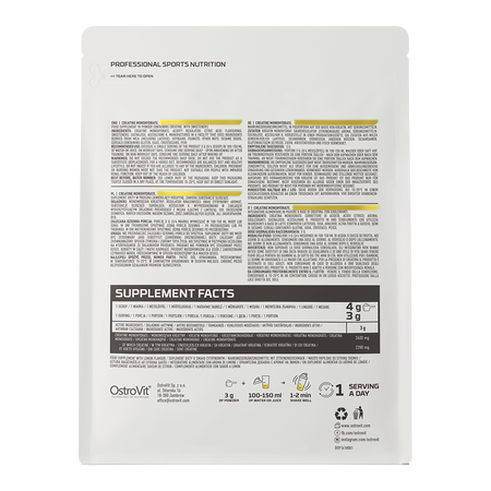 OstroVit utiliza monohidrato de creatina, es decir, la combinación de una molécula de creatina con una molécula de agua en una sola molécula - debido a que la creatina es un compuesto hidrófilo, se combina fácilmente con el agua y por lo tanto es una sustancia con una excelente biodisponibilidad. El monohidrato de creatina es la forma más simple de creatina en términos de su estructura, y al mismo tiempo el compuesto más popular entre los atletas - es ideal tanto para principiantes en estilos de vida activos como para profesionales, debido al hecho de que la creatina aumenta el rendimiento físico en el caso de ejercicios físicos sucesivos, cortos y muy intensos, y los efectos beneficiosos se producen cuando se consumen 3 g de creatina al día.