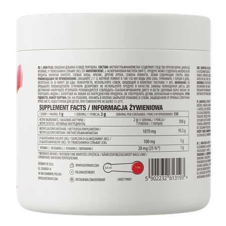 OstroVit MSM Plus es un complemento alimenticio que proporciona una fuente de metilsulfonilmetano, también conocido como azufre orgánico. Además, la fórmula se ha enriquecido con valiosos ingredientes como la vitamina C y la glucosamina. Este producto de alta calidad está disponible en forma de polvo y ha sido desarrollado para atletas y personas que desean complementar su dieta diaria con valiosos compuestos.