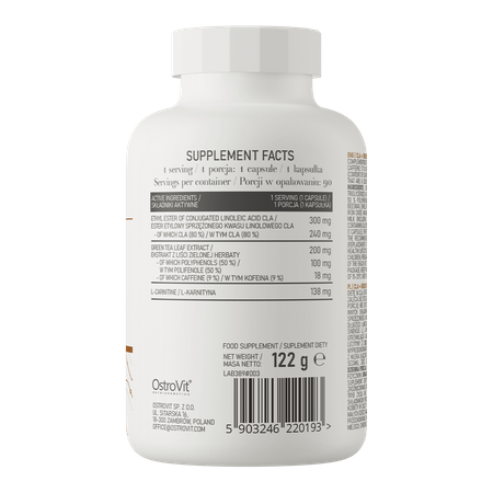 - Fuente de compuestos valiosos - una porción del complemento alimenticio aporta al organismo 300 mg de éster etílico del ácido linoleico conjugado CLA, así como 200 mg de extracto de hoja de té verde estandarizado al 50% de polifenoles y al 9% de cafeína y 138 mg de L-carnitina.