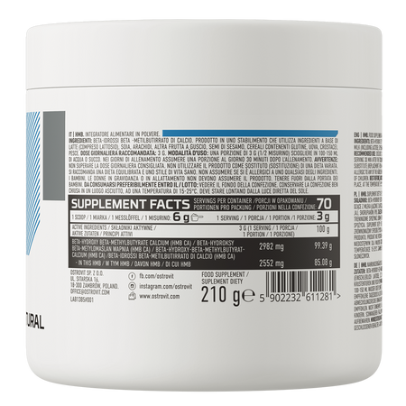 OstroVit HMB es un suplemento dietético de alta calidad que proporciona una fuente de beta-hidroxi beta-metilbutirato. Se trata de una fórmula de composición sencilla y sabor natural, disponible en un cómodo formato en polvo. Es un producto diseñado para deportistas y personas físicamente activas que desean complementar su dieta con el valioso compuesto.