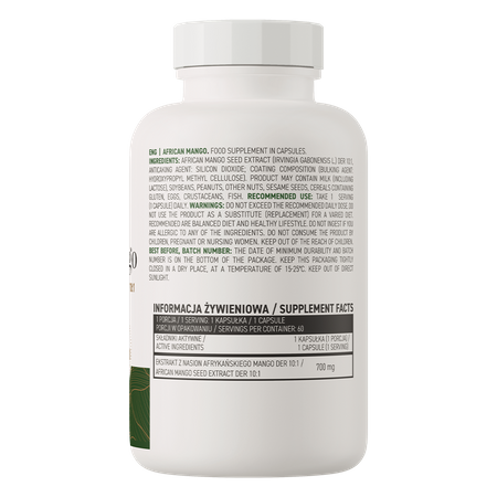 OstroVit Mango Africano es un suplemento dietético de alta calidad que contiene extracto de semilla de mango africano DER 10:1. Es un preparado vegano, disponible en cápsulas fáciles de tragar. Es un producto creado para personas que desean complementar su dieta diaria con ingredientes valiosos.