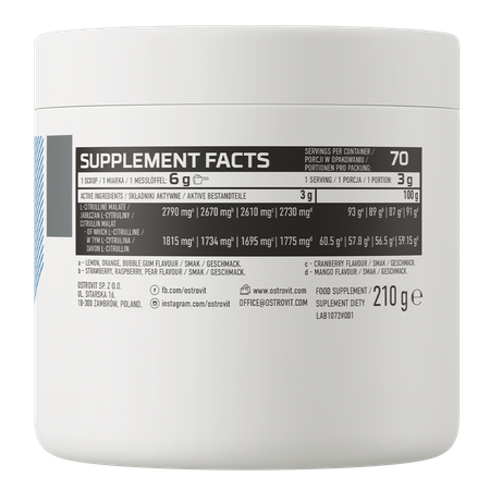 OstroVit Citrulina es un suplemento dietético de alta calidad que contiene malato de citrulina. Es un producto con un delicioso sabor a chicle, disponible en un cómodo formato en polvo que no contiene azúcares añadidos. Es un producto diseñado para deportistas y personas físicamente activas que desean complementar su dieta con valiosos compuestos.