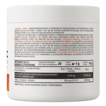 Colágeno es una de las principales proteínas de musculación, un polímero natural y un componente esencial de la sustancia intercelular de los organismos animales. Es una proteína estructural que representa aprox. 30% de todas las proteínas del cuerpo humano. Pueden encontrarse m.en. en el tejido conjuntivo, los vasos sanguíneos, los músculos, la piel y el cabello. Dado que el nivel de colágeno en el organismo disminuye con la edad como consecuencia de los procesos naturales de envejecimiento, merece la pena suministrar al organismo este compuesto también desde el exterior: el colágeno se encuentra m.en. en huesos o tendones de animales, y también está disponible en forma de suplementos dietéticos. El colágeno bovino utilizado en OstroVit se distingue por su muy buena biodisponibilidad, lo que significa que se absorbe fácilmente en el sistema digestivo humano. Además, el colágeno bovino no tiene el olor característico que a veces se puede encontrar en los suplementos dietéticos a base de colágeno de pescado.