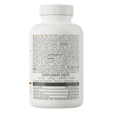 OstroVit Biotina Plus es un complemento alimenticio completo que proporciona una fuente de valiosas sustancias activas: biotina, zinc, selenio y ácido fólico. Un producto disponible en un cómodo formato de comprimidos, diseñado para personas que desean complementar su dieta diaria con valiosos ingredientes y tener un aspecto sano y bello.