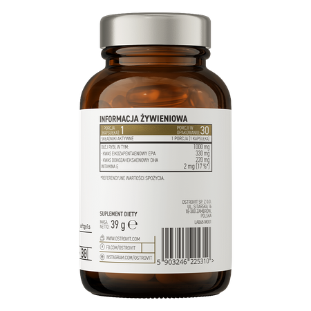 OstroVit Pharma Elite Omega 3 es un complemento alimenticio de alta calidad a base de aceite de pescado, que es una fuente de ácidos grasos poliinsaturados omega-3. La fórmula contiene valiosos compuestos como el ácido eicosapentaenoico (EPA) y el ácido docosahexaenoico (DHA), así como vitamina E. Es un producto de la elitista línea Pharma Elite, creada para consumidores conscientes, y está disponible en cápsulas de gelatina blanda.