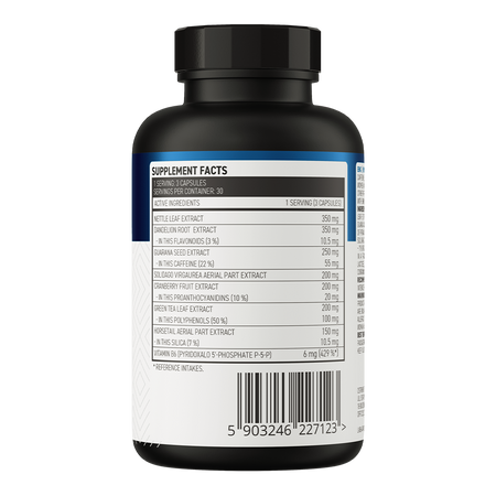 - Fuente de 8 valiosos ingredientes - una ración del complemento alimenticio aporta al organismo 350 mg de extracto de hojas de ortiga, 350 mg de extracto de raíz de diente de león estandarizado al 3% de flavonoides, 250 mg de extracto de semillas guaranas estandarizado al 22% de cafeína, 200 mg de partes molidas de vara de oro, 200 mg de extracto de fruto de arándano estandarizado al 10% de proantocianidinas, 200 mg de extracto de hoja de té verde estandarizado al 50% de polifenoles y 150 mg de extracto de partes molidas de cola de caballo de campo estandarizado al 7% de sílice y 6 mg de vitamina B6.