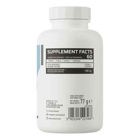 OstroVit MSM 1200 mg es un complemento alimenticio que proporciona una fuente de metilsulfonilmetano, también conocido como azufre orgánico. Es un preparado de alta calidad con una formulación sencilla, disponible en cápsulas fáciles de tragar. Es un producto diseñado para deportistas y personas que desean complementar su dieta diaria con un valioso compuesto.