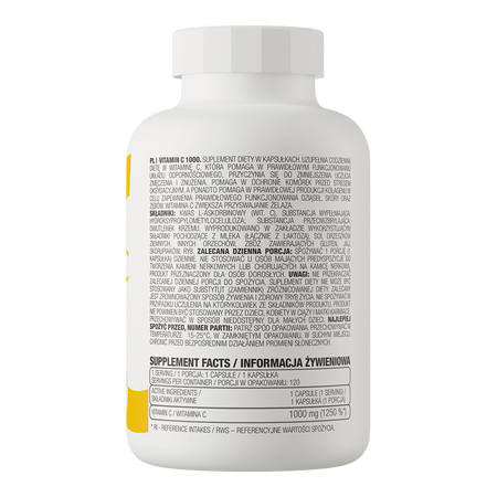 OstroVit Vitamina C 1000 mg es un complemento alimenticio de alta calidad que proporciona una fuente de ácido L-ascórbico. Es un producto disponible en forma de cápsulas fáciles de tragar, que se distingue por su composición sencilla y no contiene aditivos innecesarios. Es un preparado diseñado para las personas físicamente activas y las que tienen una mayor necesidad de vitamina C.