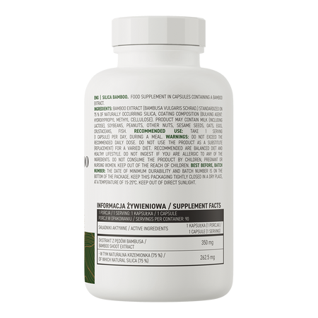 - Contiene extracto de bambú estandarizado al 75% de sílice natural - una ración del complemento alimenticio aporta al organismo 350 mg del extracto.