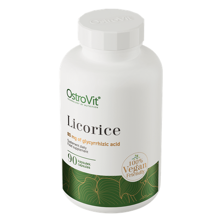 OstroVit Regaliz VEGE es un complemento alimenticio de alta calidad a base de extracto de raíz de regaliz estandarizado al 20% de ácido glicirrícico. Se trata de un preparado vegano disponible en forma de cápsulas fáciles de tragar, diseñado para personas preocupadas por tener un aspecto sano y bello y por complementar su dieta con un valioso compuesto.