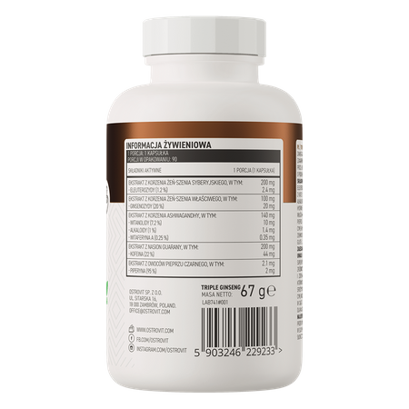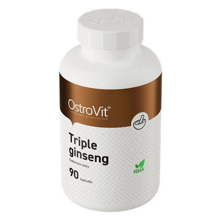 OstroVit Triple Ginseng VEGE es un complemento alimenticio vegano que contiene cinco extractos vegetales diferentes: extracto de raíz de ginseng siberiano y extracto de raíz de ginseng, extracto de raíz de ashwagandha, extracto de semilla de guaraná y extracto de fruto de pimienta negra. Se trata de un preparado disponible en forma de cápsulas fáciles de tragar, creado para consumidores conscientes que desean complementar su dieta diaria con valiosos ingredientes.