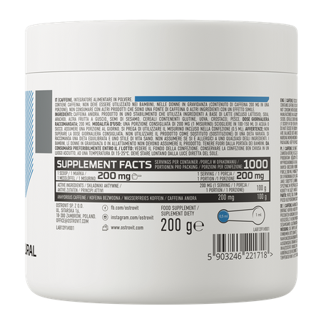 OstroVit Cafeína en polvo es un suplemento dietético de alta calidad que proporciona una fuente de cafeína. Es una fórmula de composición sencilla y sabor natural, disponible en polvo. Es un producto diseñado para personas que desean estimular el organismo y complementar su dieta diaria con el valioso compuesto.