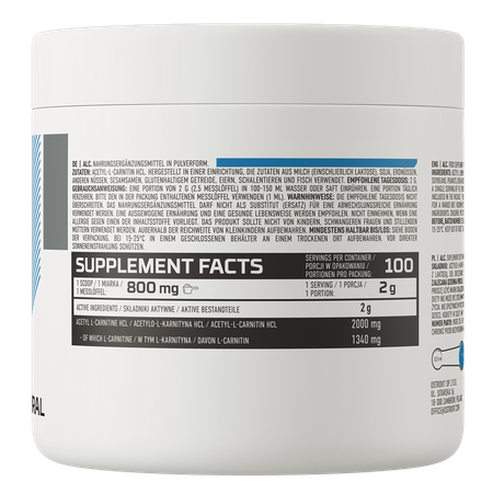 - Fuente de L-carnitina - una ración del suplemento dietético aporta al organismo 2000 mg de acetil-L-carnitina HCl.