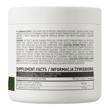El guaraná es popular sobre todo por su alto contenido en cafeína: las semillas de la planta contienen más cantidad de este valioso ingrediente que el café, el té o la yerba mate. El extracto de semilla de guaraná utilizado en OstroVit está estandarizado al 22% de cafeína, lo que tiene un efecto positivo en la calidad del suplemento dietético y garantiza un alto contenido del valioso compuesto en cada porción del producto.Tomar 1 dosis - 500 mg (1 vasito dosificador) al día con una comida, bebiendo agua. Utilice el vaso dosificador incluido en el envase (1 ml).