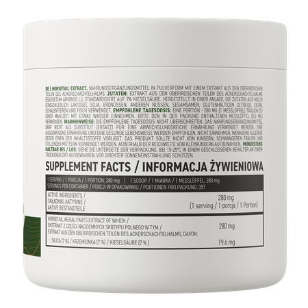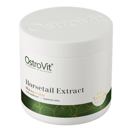 OstroVit Extracto de Cola de Caballo es un complemento alimenticio que contiene un extracto de las partes aéreas de la cola de caballo estandarizado al 7% de sílice. Se trata de una fórmula de alta calidad disponible en un cómodo formato en polvo, que ha sido desarrollada para consumidores conscientes que se preocupan por un aspecto bello y saludable.