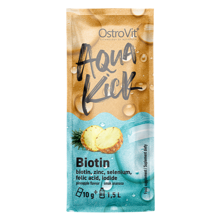 OstroVit Aqua Kick Biotin es un suplemento dietético completo que proporciona una fuente de biotina, así como zinc, selenio, ácido fólico y extracto de hoja japonesa. Se trata de un exótico preparado con sabor a piña disponible en forma de polvo hidrosoluble. Es un producto creado para las personas que desean tener un aspecto sano y bello.