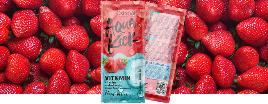 OstroVit Aqua Kick VIT&MIN to kompleksowy suplement diety, który stanowi źródło cennych witamin i składników mineralnych. To preparat o pysznym, truskawkowym smaku, dostępny w saszetce w postaci rozpuszczalnego w wodzie proszku. To produkt stworzony z myślą o osobach, którym zależy na uzupełnieniu codziennej diety w wartościowe mikroskładniki.