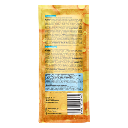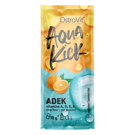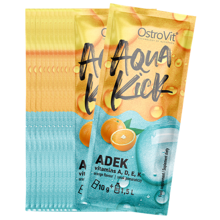 OstroVit Aqua Kick ADEK es un complemento alimenticio que proporciona una fuente de vitaminas liposolubles como la vitamina A, la vitamina D y las vitaminas E y K. Se trata de un preparado moderno con un sabor único a naranja, que se presenta en una práctica bolsita. Se trata de un producto diseñado para personas físicamente activas, que permite un aporte ininterrumpido de valiosos micronutrientes.
