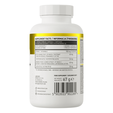 - Fuente de tres valiosos compuestos - una porción del complemento alimenticio aporta al organismo 900 mg de vitamina C, así como 60 mg de extracto de fruto de naranja amarga estandarizado al 60% de hesperidina y 40 mg de extracto de flor de perla japonesa estandarizado al 95% de rutina.