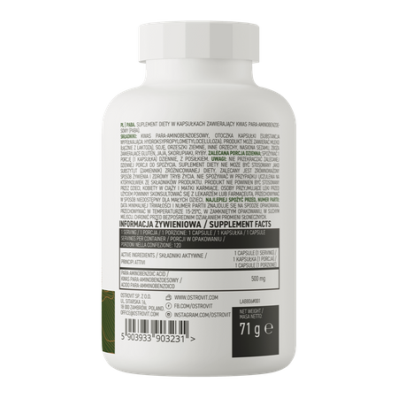 OstroVit PABA VEGE es un complemento alimenticio de alta calidad que proporciona una fuente de ácido para-aminobenzoico. Se trata de un preparado vegano, disponible en forma de cápsulas fáciles de tragar, diseñado para las personas que desean complementar su dieta diaria con un valioso compuesto.