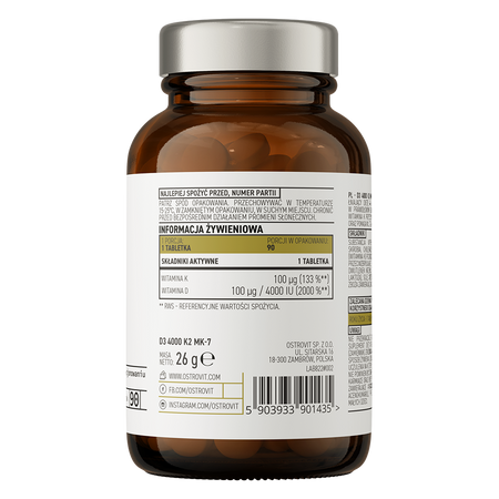 OstroVit Vitamina D3 4000 UI + K2 es un suplemento dietético de alta calidad que proporciona una fuente de vitamina D3 y vitamina K2, en forma de MK-7, que es la mejor absorbida por el cuerpo humano. Preparado en forma de comprimidos fáciles de tragar, diseñado para personas que necesitan complementar su dieta diaria con valiosos micronutrientes.