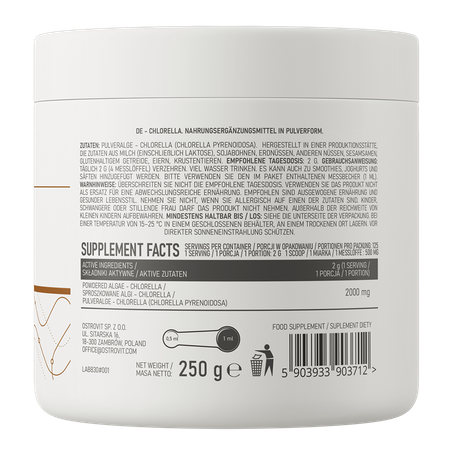 OstroVit Chlorella es un complemento alimenticio de alta calidad que proporciona una fuente de algas en polvo, como la chlorella. Es un preparado vegano, disponible en forma de polvo fácil de usar. Es un producto creado para personas que desean complementar su dieta diaria con ingredientes valiosos.