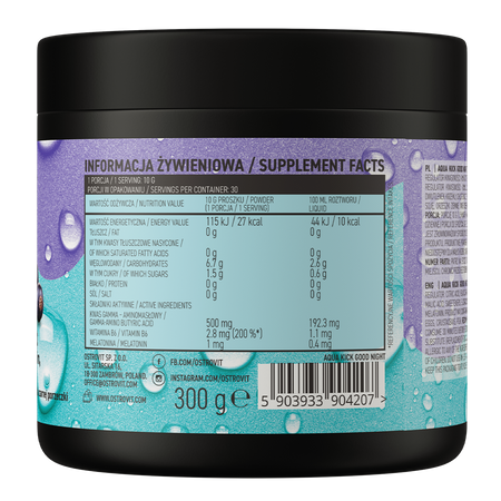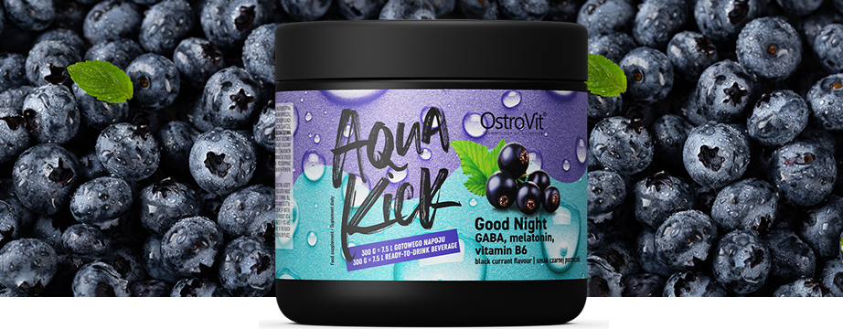 OstroVit Aqua Kick Good Night es un complemento alimenticio que contiene un conjunto de tres ingredientes como son el ácido gamma-aminobutírico, la vitamina B6 y la melatonina. Se trata de un preparado con un delicioso sabor a grosella negra, disponible en polvo, que se disuelve perfectamente en agua. Es un producto creado para personas que se preocupan por una regeneración adecuada y un sueño de alta calidad.