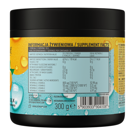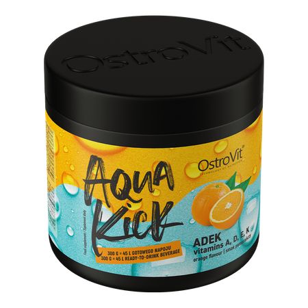 OstroVit Aqua Kick ADEK es un suplemento dietético que proporciona una fuente de vitaminas liposolubles - el producto contiene vitamina A y vitamina D, así como vitamina E y K. Es un preparado con un sabor único a naranja, disponible en polvo. Se trata de un producto diseñado para personas físicamente activas, que permite un aporte ininterrumpido de valiosos micronutrientes.