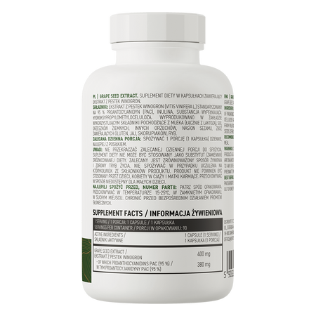 Semillas de uva es una fuente de macro y micronutrientes. Las semillas también contienen muchas sustancias valiosas, y se considera que el componente más importante presente en las semillas de uva son las proantocianidinas oligoméricas (PAC), que se clasifican como flavonoides y tienen potencial antioxidante. Así pues, el extracto de semilla de uva se utiliza habitualmente como ingrediente de suplementos dietéticos, además de ser un valioso componente de cosméticos destinados al rostro, el contorno de ojos o el cuidado del cabello.El extracto de semilla de uva utilizado en OstroVit está estandarizado al 95% de proantocianidinas, lo que tiene un efecto positivo en la calidad del producto y convierte al suplemento en una valiosa fuente de valiosos compuestos.Tomar 1 dosis (1 cápsula) al día, preferentemente con las comidas.