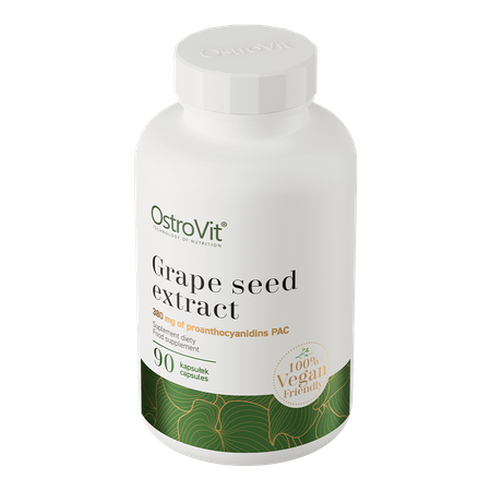 OstroVit Extracto de semilla de uva VEGE es un suplemento dietético de alta calidad que contiene extracto de semilla de uva estandarizado al 95% de proantocianidinas. Se trata de un preparado vegano, disponible en forma de cápsulas fáciles de tragar, diseñado para personas que desean complementar su dieta diaria con valiosos compuestos.