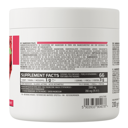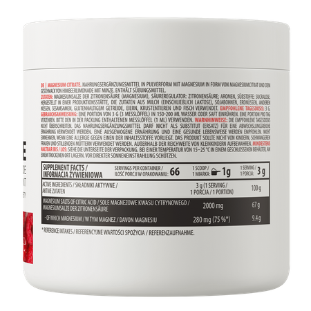 OstroVit Citrato de Magnesio es un suplemento dietético de alta calidad que proporciona una fuente de magnesio, en la forma altamente biodisponible de citrato de magnesio. Es un preparado con el delicioso sabor de la limonada de frambuesa con menta, disponible en un cómodo formato en polvo. Es un producto diseñado para personas que desean complementar su dieta diaria con el valioso micronutriente.