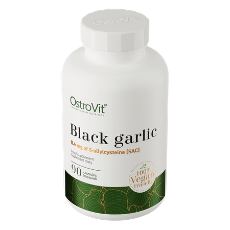 OstroVit Ajo Negro VEGE es un complemento alimenticio de alta calidad que contiene extracto de ajo negro fermentado, estandarizado al 0,1% de S-alilocisteína (SAC). Se trata de un preparado vegano, disponible en forma de cápsulas fáciles de tragar, diseñado para las personas que desean apoyar el trabajo de todo el organismo.