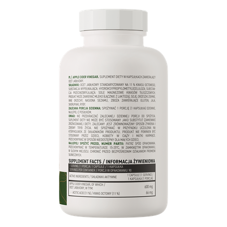 OstroVit Vinagre de Sidra de Manzana es un suplemento dietético de alta calidad que es una fuente de vinagre de sidra de manzana estandarizado al 11% de ácido acético. Se trata de un preparado vegano disponible en forma de cápsulas fáciles de tragar, diseñado para personas preocupadas por tener un aspecto saludable y bello, así como por complementar su dieta diaria con el valioso compuesto.