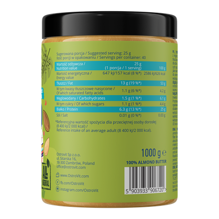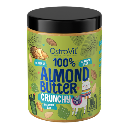 OstroVit 100% Crema de Almendras es un producto de textura no uniforme, que contiene trozos de almendras crujientes y es ideal tanto para platos dulces como salados. Es un suplemento dietético único para deportistas y personas que buscan una figura esbelta, que no contiene ingredientes innecesarios y está libre de azúcar y sal añadidos.