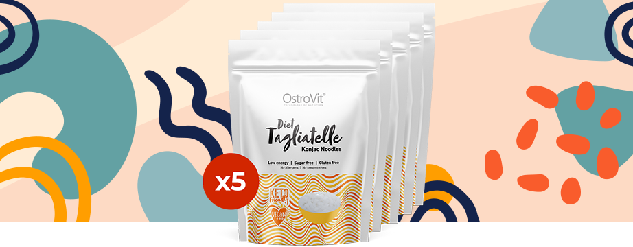 OstroVit Diet Tagliatelle Konjac Noodles es un producto revolucionario en forma de pasta de preparación rápida y muy baja en calorías. La pasta no contiene azúcares añadidos ni gluten y se distingue por su bajísimo contenido en grasas. El producto es apto para vegetarianos y veganos, ya que no contiene ingredientes de origen animal. Su bajo contenido en hidratos de carbono hace que nuestros tallarines sean ideales para quienes siguen una dieta cetogénica. Busca una pasta baja en calorías que sea un complemento versátil para muchos platos? Pruebe OstroVit Diet Tallarines Konjac!