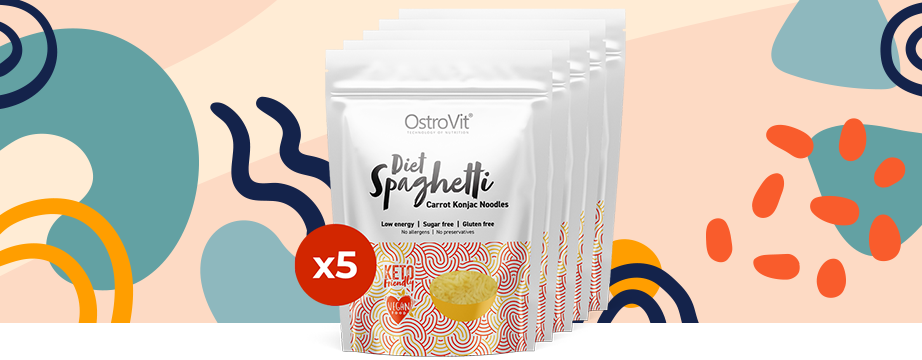 OstroVit Diet Spaghetti Carrot Konjac Noodles es el equivalente bajo en calorías de los clásicos fideos spaghetti. El producto se elabora con harina de konjac y zanahoria en polvo. La pasta no contiene gluten ni azúcares añadidos en sus ingredientes. Se caracteriza por su bajo índice glucémico y su bajo contenido en grasas. Busca una alternativa sabrosa a la clásica pasta de trigo? No deje de probar OstroVit Diet Espaguetis Zanahoria Fideos Konjac!