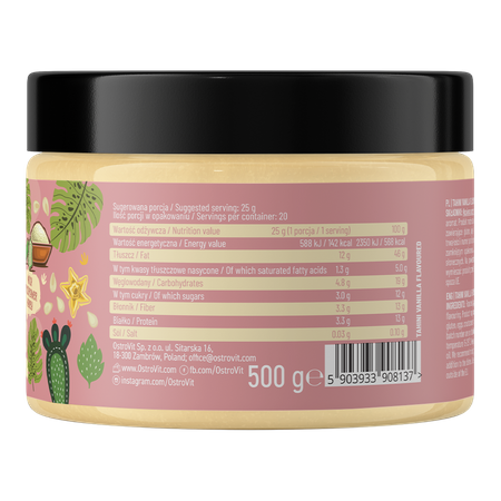 OstroVit Tahini es una pasta rica en proteínas a base de semillas de sésamo tostadas, miel multifloral y aceite MCT con aroma de vainilla. La pasta se distingue por su dulce sabor oriental y su riqueza en vitaminas y minerales naturales. Buscando ideas para bocadillos sabrosos y sanos? No te imaginas unas tortitas, unos copos de avena o una tortilla sin aderezos dulces? No deje de probar nuestra pasta de sésamo - OstroVit Tahini con sabor a vainilla.