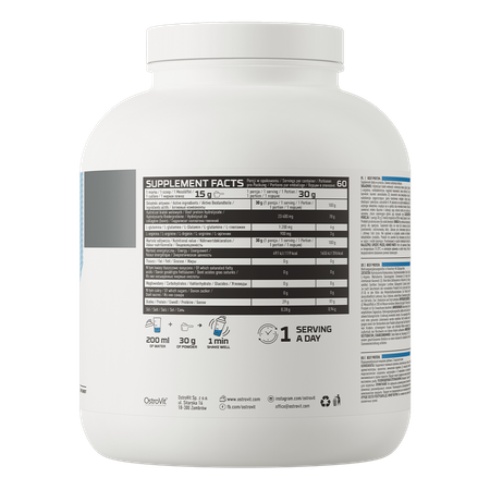 - Enriquecido con valiosos aminoácidos - una porción del producto contiene 1200 mg de L-glutamina y 900 mg de L-arginina.