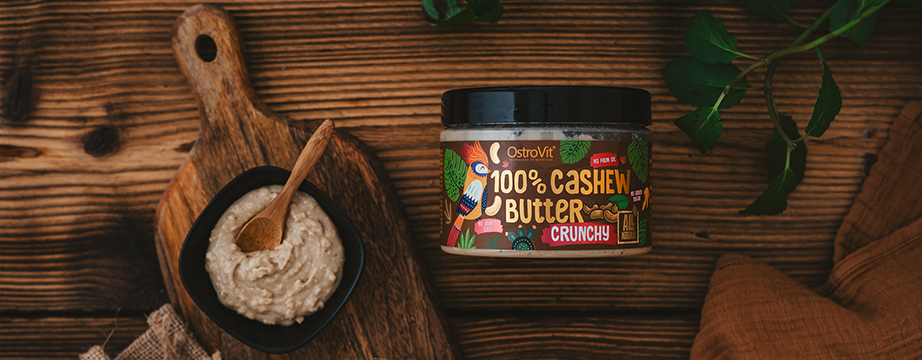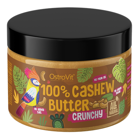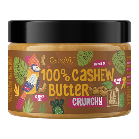 OstroVit 100% Mantequilla de Anacardos es un producto excelente y único, creado para los gourmets más exigentes, pero también para las personas que cuidan una figura esbelta, hacen deporte y para quienes limitan el exceso perjudicial de sal o azúcar en su dieta. El sabor profundo y pleno de los anacardos combina a la perfección como guarnición dulce y salada. Es una auténtica bomba de valiosos ácidos grasos, proteínas y minerales. Profundidad de sabor, 100% de satisfacción y garantía de la más alta calidad - OstroVit 100% Cashew Butter.