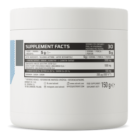 - Fuente de tres valiosos ingredientes - una ración del complemento alimenticio aporta al organismo 3000 mg de tartrato de L-carnitina, 200 µg de cromo y 1000 mg de éster etílico del ácido linoleico conjugado CLA, que contiene 550 mg de CLA.