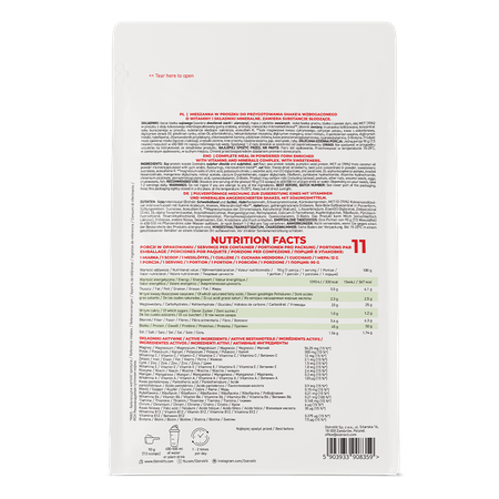 Aislado de proteína de soja (contiene dióxido de azufre y sulfitos), harina de copos de avena, aislado de proteína de guisante, proteína de semilla de calabaza, aceite MCT (70%), aceite de coco en polvo microencapsulado con goma arábiga, aromas, mezcla de micronutrientes**, fibra de avena, fresa liofilizada, zumo de remolacha en polvo concentrado, edulcorantes: sucralosa, acesulfamo K.