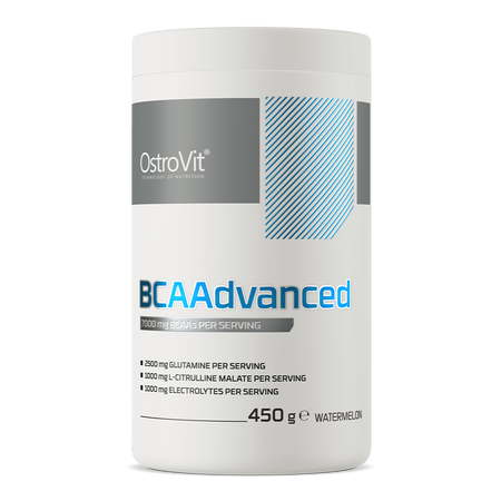 OstroVit BCAAdvanced es un suplemento dietético de alta calidad que proporciona una fuente de aminoácidos BCAA, así como L-glutamina, L-citrulina, vitamina B6 y los valiosos electrolitos potasio, magnesio, sodio y cloruro. Es una fórmula sin azúcar, disponible en polvo, en cuatro sabores diferentes. Es un producto que será un gran suplemento dietético para deportistas y personas físicamente activas.