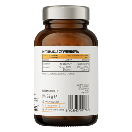 - Fuente de vitamina D3 y K2 - un comprimido del suplemento dietético proporciona al organismo 2000 UI de colecalciferol y 50 μg de menaquinona-7-MK-7.