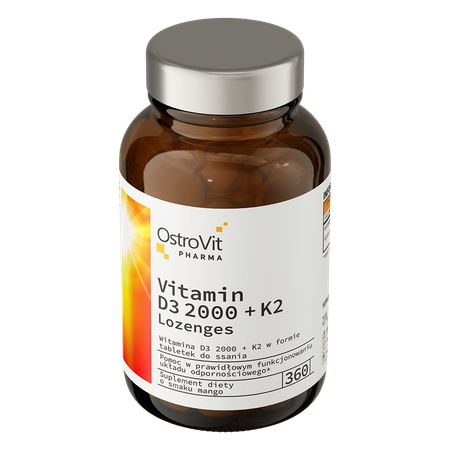 OstroVit Pharma Vitamina D3 2000 IU + K2 es un suplemento dietético de alta calidad que proporciona vitamina D3 y vitamina K2 en forma de menaquinona-7-MK-7, que es fácilmente absorbida por el cuerpo humano. Es un preparado con un delicioso sabor a mango, disponible en forma de pastillas que garantizan una suplementación sin complicaciones. Es un producto de la línea de élite OstroVit Pharma, creada para personas que desean complementar su dieta diaria con un compuesto valioso.